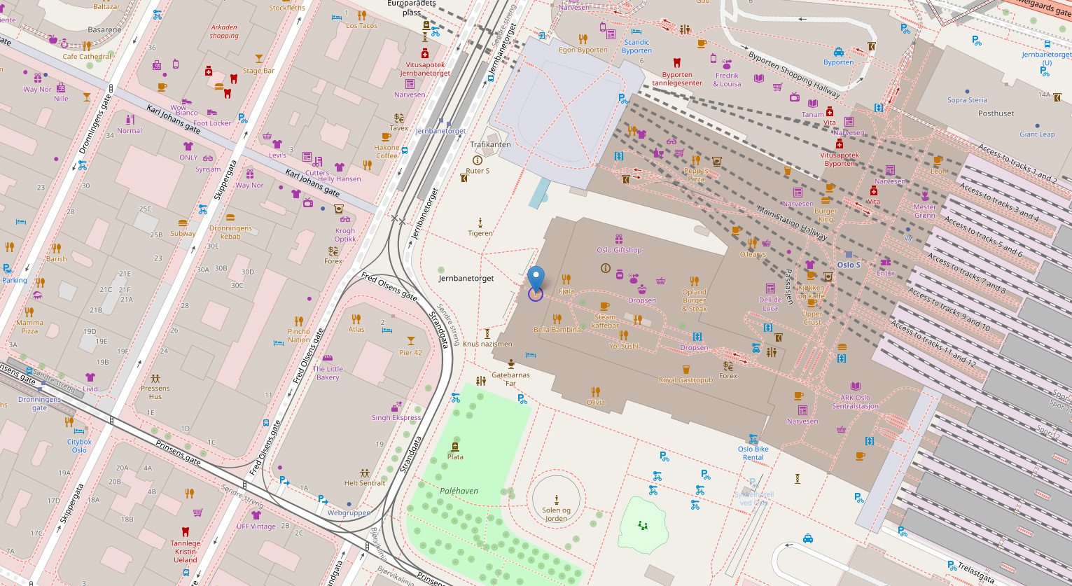 You’ll find Oslo Central train station at Jernbanetorget 1, NO-0154 Oslo, Norway.